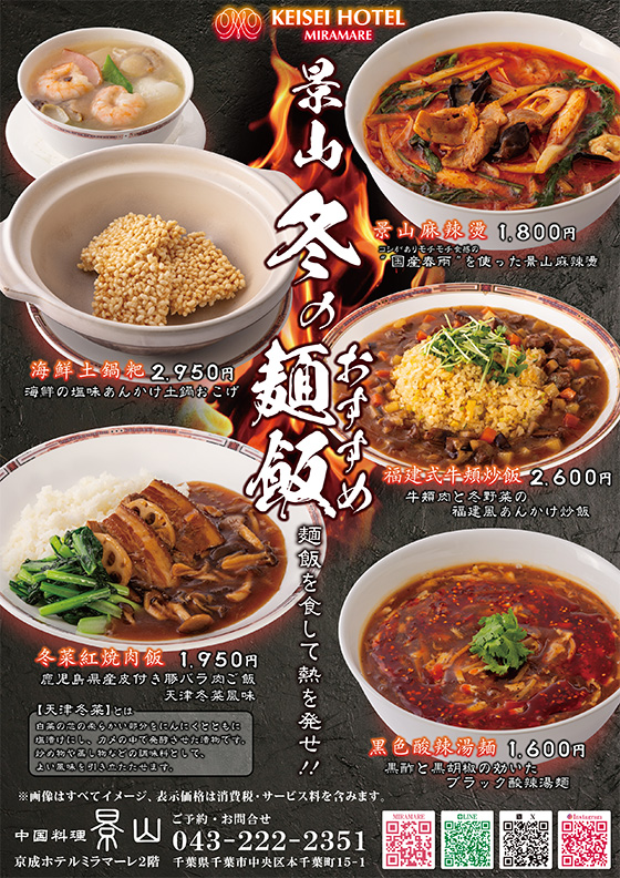 非日常の空間で気軽に寛げるカフェレストラン「ミレフォリア」、千葉県産の食材を活かし四季折々のお料理が楽しめるレストラン「ディスカーロ」、京成飯店から続く伝統の味を守りつつ新しい風を感じる中国料理「景山」。ホテルシェフが自慢の腕を振るう上質で洗練されたお料理に心躍る楽しいひとときをお過ごしください。