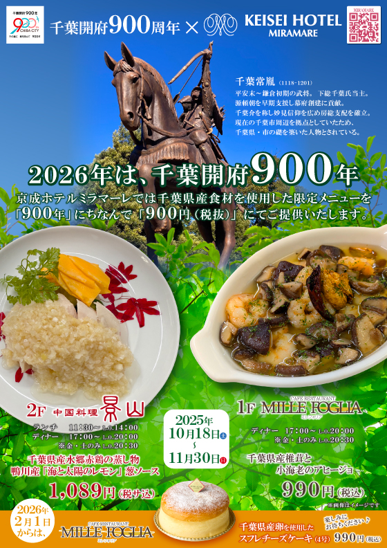 非日常の空間で気軽に寛げるカフェレストラン「ミレフォリア」、千葉県産の食材を活かし四季折々のお料理が楽しめるレストラン「ディスカーロ」、京成飯店から続く伝統の味を守りつつ新しい風を感じる中国料理「景山」。ホテルシェフが自慢の腕を振るう上質で洗練されたお料理に心躍る楽しいひとときをお過ごしください。