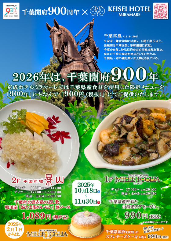 非日常の空間で気軽に寛げるカフェレストラン「ミレフォリア」、千葉県産の食材を活かし四季折々のお料理が楽しめるレストラン「ディスカーロ」、京成飯店から続く伝統の味を守りつつ新しい風を感じる中国料理「景山」。ホテルシェフが自慢の腕を振るう上質で洗練されたお料理に心躍る楽しいひとときをお過ごしください。