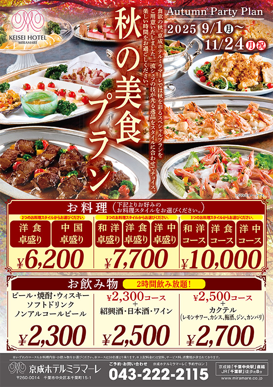 食欲の秋。京成ホテルミラマーレでは秋を彩るスペシャルプランをご用意いたしました。一流シェフの技が光る逸品をスタイルに合わせてチョイス。楽しい時間をお過ごしください。
