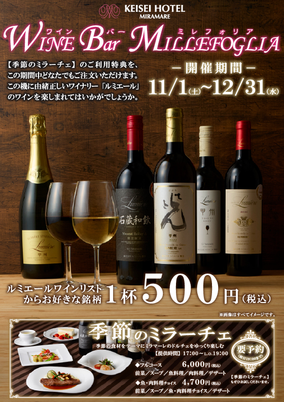 【季節のミラーチェ】のご利用特典を、この期間中どなたでもご注文いただけます。 この機に由緒正しいワイナリー「ルミエール」のワインを楽しまれてはいかがでしょうか。 ルミエールワインリストからお好きな銘柄1杯 500円 ...