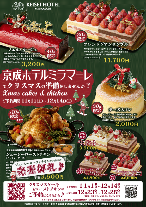 ご予約受付────────────────────── 【ご予約】 11月1日(土)~12月14日(日) 【受 付】 インターネット予約にて受付 (https://miramare.take-eats.jp/) ...