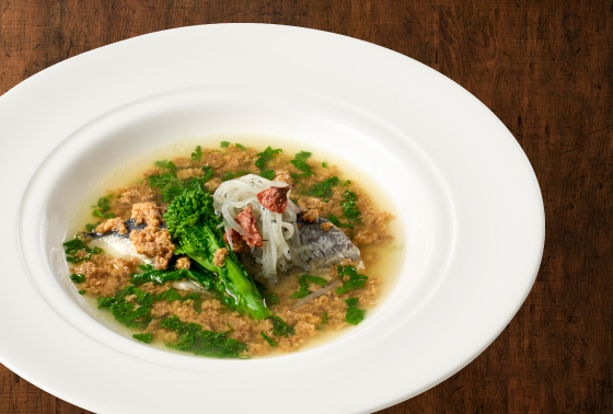 「ひとつの食材、ふたつの世界」- その時期ならではの旬の食材をテーマに、中国料理とフランス料理、ふたつの異なる世界観が楽しめる。3・4月は青森。 ・鰆のポワレ モクズ蟹と菜の花のスープ仕立て 桜をまとった小川原湖産...